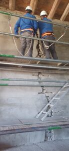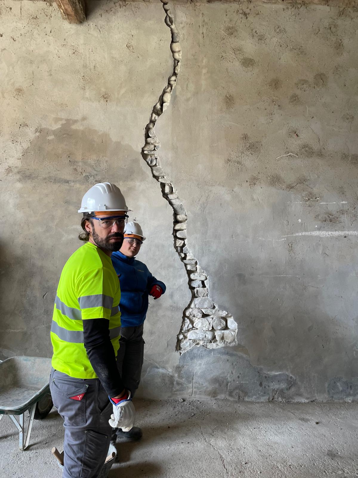 En Ascara hay una nave con grietas por la parte interior que tenemos que reparar. Para ello formamos tres grupos montando medios auxiliares como un andamio y borriquetas, unos se encargaban de limpiar y picar las grietas, para picar utilizamos una maceta un cincel y un martillo percutor, para limpiar utilizamos agua y cepillos para quitar el polvo. Los compañeros que estaban en el andamio se encargaban de picar y limpiar la parte de arriba y los demas con las borriquetas se ocupaban de la parte de abajo.